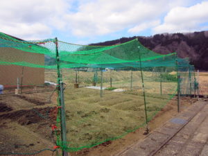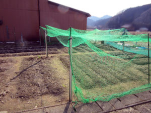 畑に鳥が侵入しないように、グリーンネットを支柱に引っ掛ける作業をおこないました。