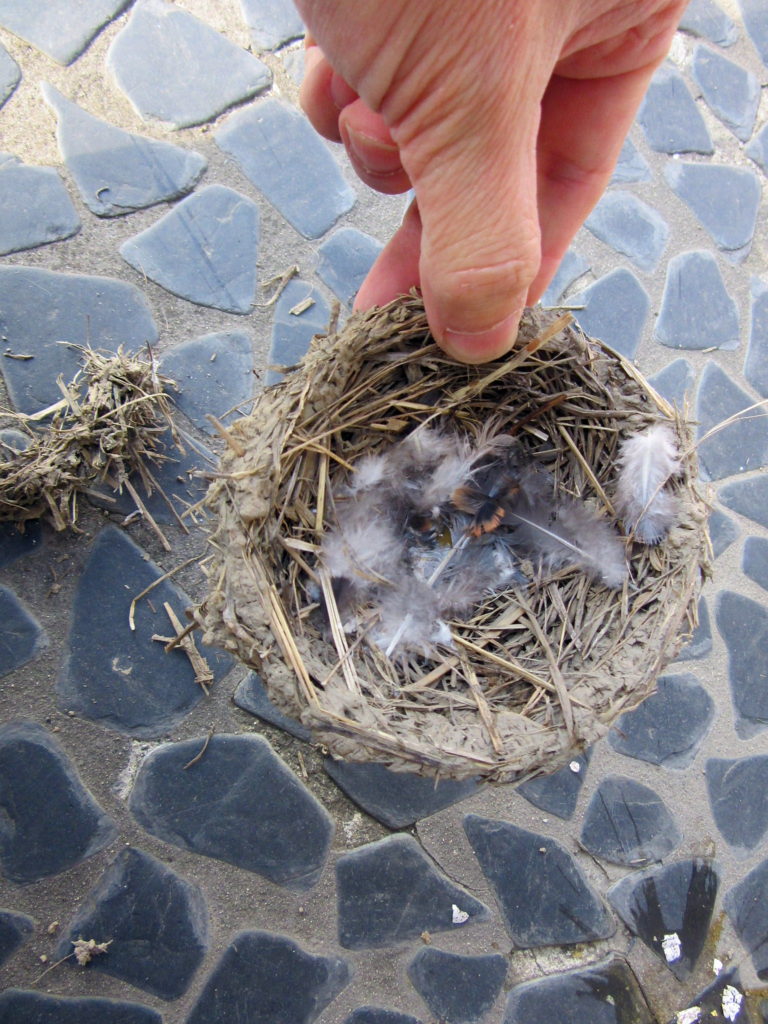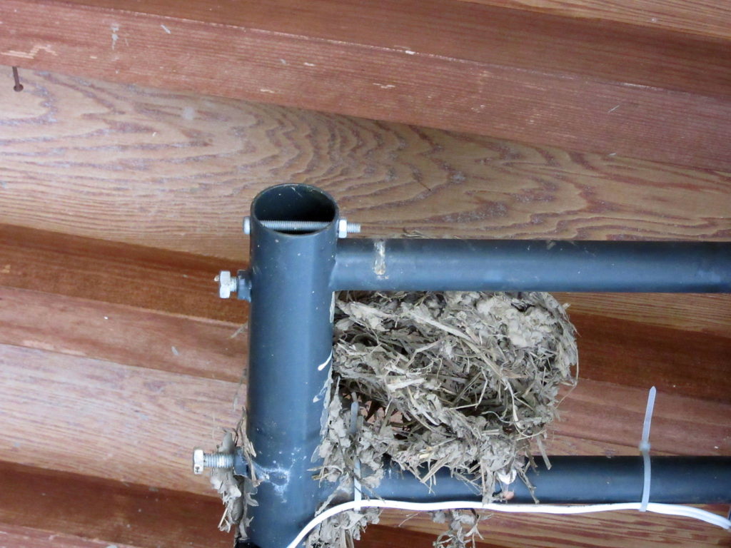 おそらく、安定しない丸い円柱に巣を作って、バランスを崩して横へずれてしまったらしい。