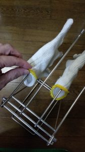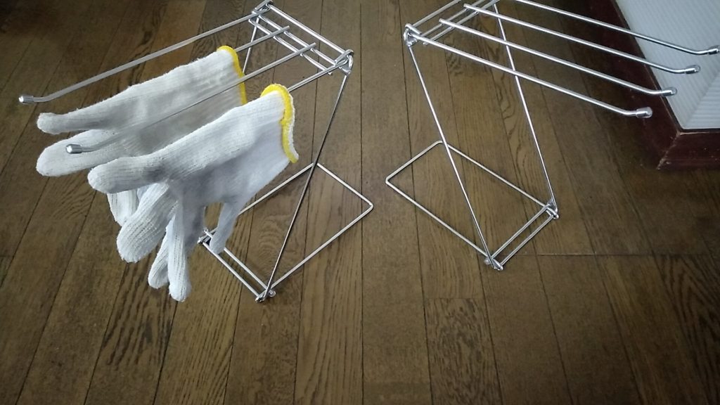 用意するのは、ダイソーに売っているステンレスふきん掛けと石油ファンヒーター。豪雪地域では、石油ストーブを持っているお家が多いですが、そのストーブの中でも最も効率よく温めるなら温風の出る石油ファンヒーターが一番です。その温風を利用して、ステンレスふきん掛けをすこし温風先から離して設置、それに手袋の指部分をステンレス棒に通し掛けます。するとぺったりとしている手袋のてを通す部分が広がり、そこに温風をあてる・・・ていうわけ。効率よくかんたんに早く乾きますね。